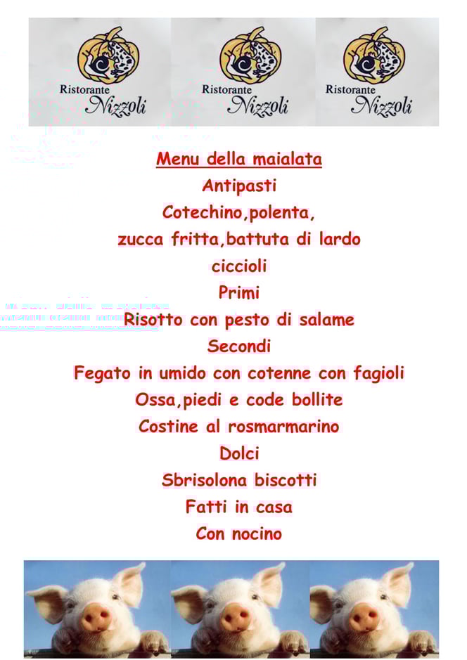 La Padania del grugnito.E dell'urlo lacerante,nel momento sacrificale,che un tempo si levava dalle corti,dalle cascine quando la campagna era bianca di brina si celebrava un rituale con due dramatis personae: il porco e il norcino.Via all'epos paganeggiante della maialata,ci si mette a tavola previa vestizione di una maglietta egualizzante e antisbrodolo sui vestiti,poi la cena arriva su lunghe assi altrettanto fraternizzanti,mentre il rossissimo,robusto lambrusco si spilla dalle botticelle e si beve in scodella.